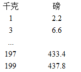 编写程序,输入一个正整数n,显示下面n+1行的表格,将千克转换成磅。(注意:1千克为2.2磅)
